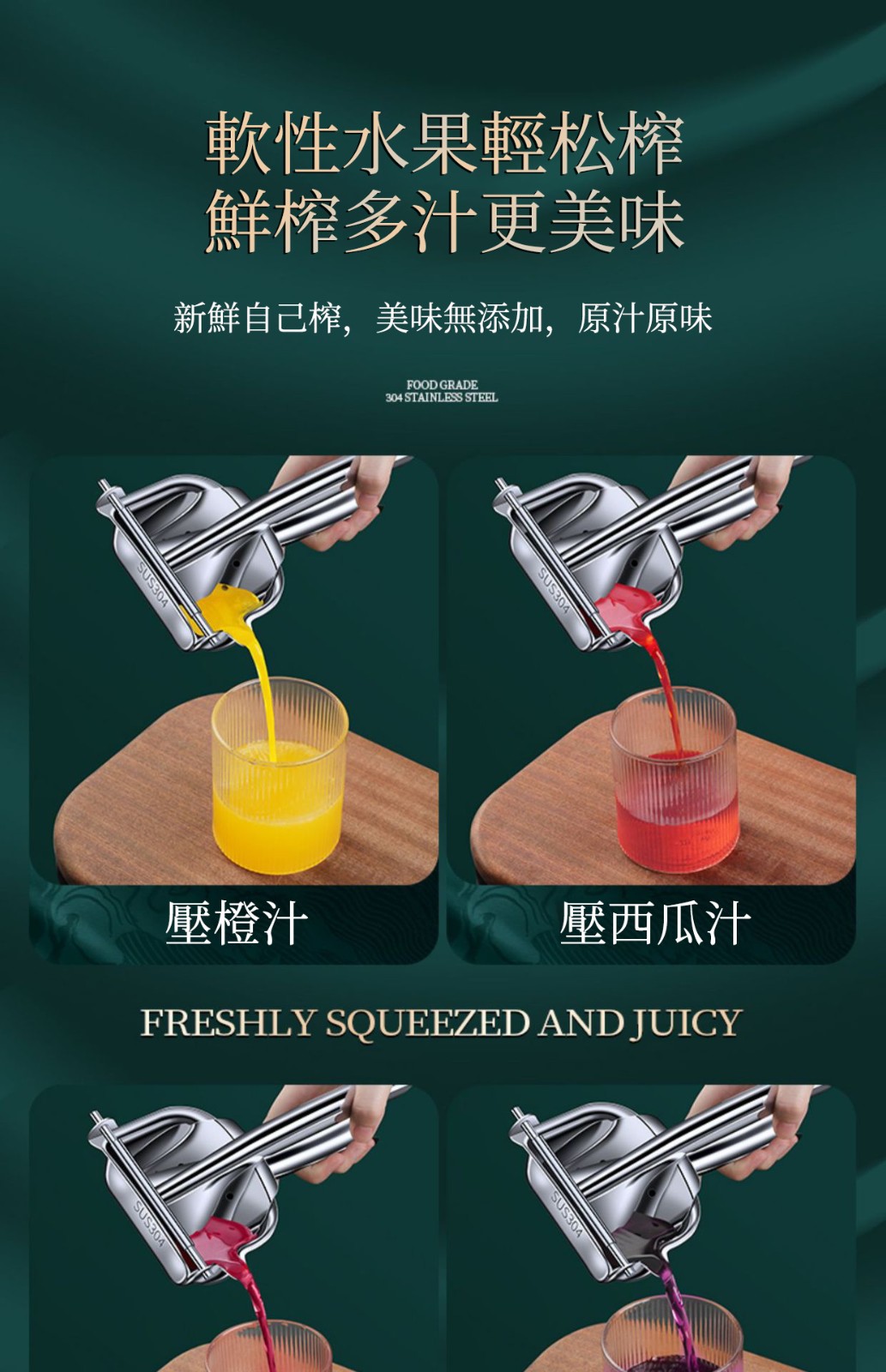 7分鐘前想喝鮮榨果汁宮又怕麻煩?304不鏽鋼手動榨汁汁來助力! 食品級材質安全耐用,鬆分離果渣與果汁,西瓜、石榴、柳丁随心榨!小巧便攜不佔地,手動按壓超解壓,新鮮健康零添加,讓你隨時隨地享原汁原味~ - 【限時下殺】買一送一 2入組NT$1298