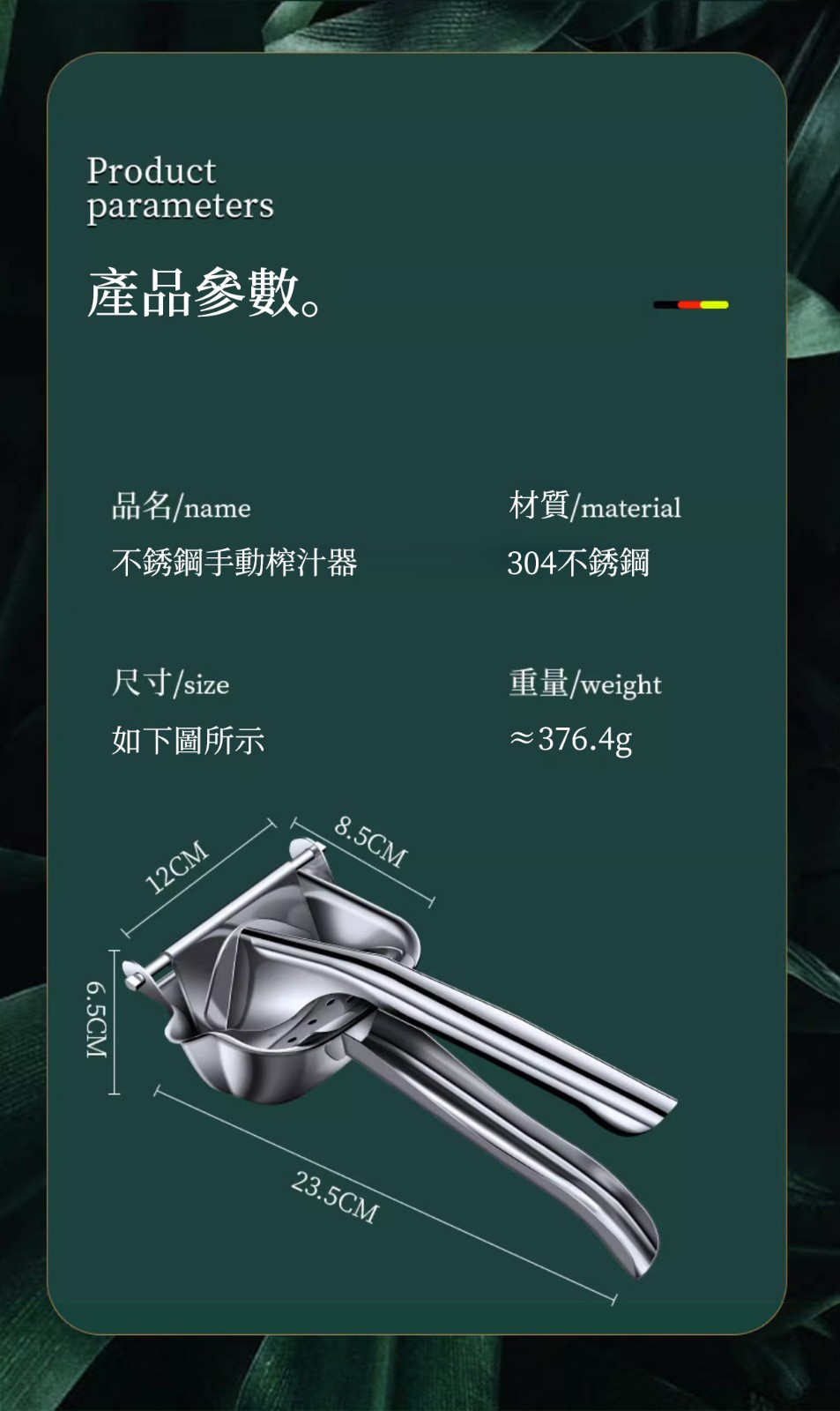 4分鐘前想喝鮮榨果汁宮又怕麻煩?304不鏽鋼手動榨汁汁來助力! 食品級材質安全耐用,鬆分離果渣與果汁,西瓜、石榴、柳丁随心榨!小巧便攜不佔地,手動按壓超解壓,新鮮健康零添加,讓你隨時隨地享原汁原味~ - 【體驗裝】1入組 NT$898